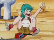 Bulma fixes the Dragon Radar, and is confused that it doesn't pick up the trace of the last Dragon Ball. Bulma decided to stay behind while Goku, Yamcha, Krillin and Puar go to meet Master Roshi's sister, Fortuneteller Baba, to help them locate the ball, but Bulma and Roshi end up getting dragged to Fortuneteller Baba's Palace by Goku as part of a plan Krillin has. Since Yamcha is a fighting See-Through the Invisible Man, and was struggling to fight, not knowing where his opponent is, Krillin has Bulma face Roshi, while pulling her shirt off, exposing her bare breasts to Roshi. Roshi then has a nose-bleed onto the invisible man revealing him to Yamcha for him to easily defeat. Afterwards, Bulma gets mad over Krillin pulling her shirt down and hits him.