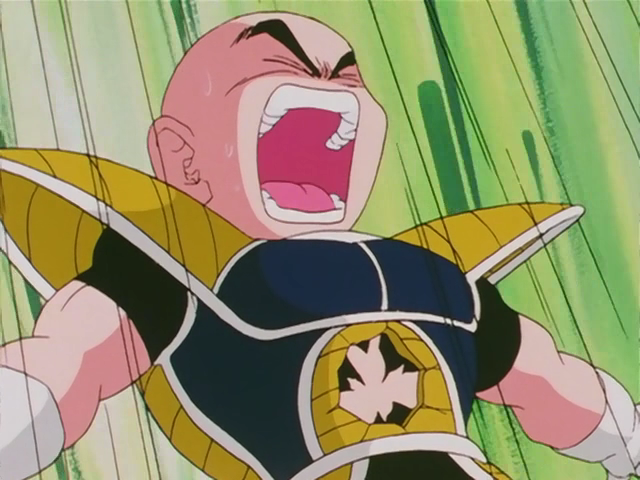 When Yamcha is quickly killed by a kamikaze Saibaman, Krillin is enraged at his friend's death and unleashes his Scattering Bullet attack that obliterates all but one. Piccolo, Vegeta, and Nappa are all impressed with the sheer power of his attack, but it is not fast enough to work on the Saiyans. The battle continues, with Chiaotzu and Tien falling. Piccolo, Krillin and Gohan come up with a plan to grab Nappa's tail to weaken him, then while he is not on guard, they blast him. However, the plan failed as Nappa had already trained his tail from attacks. Eventually Piccolo dies, taking Kami and the Dragon Balls with him, rendering Krillin and Gohan the only ones left to fight.