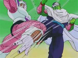 When Piccolo arrives, he finds a battle in progress between Gohan, Krillin, and Vegeta (who had rebelled against Frieza), with Dende supporting them, against Frieza. He then takes on Frieza, with the doubt of Krillin and Vegeta, who is in his second form, alone and is able to go blow to blow with him, even without removing his weighted clothing. Vegeta became shocked to find that the Namekian that Nappa killed with ease mere months ago had become so powerful. After a brief exchange of blows, Frieza transforms into his third form and assaults Piccolo with a large barrage of invisible and virtually unavoidable shots, crippling the Namekian.